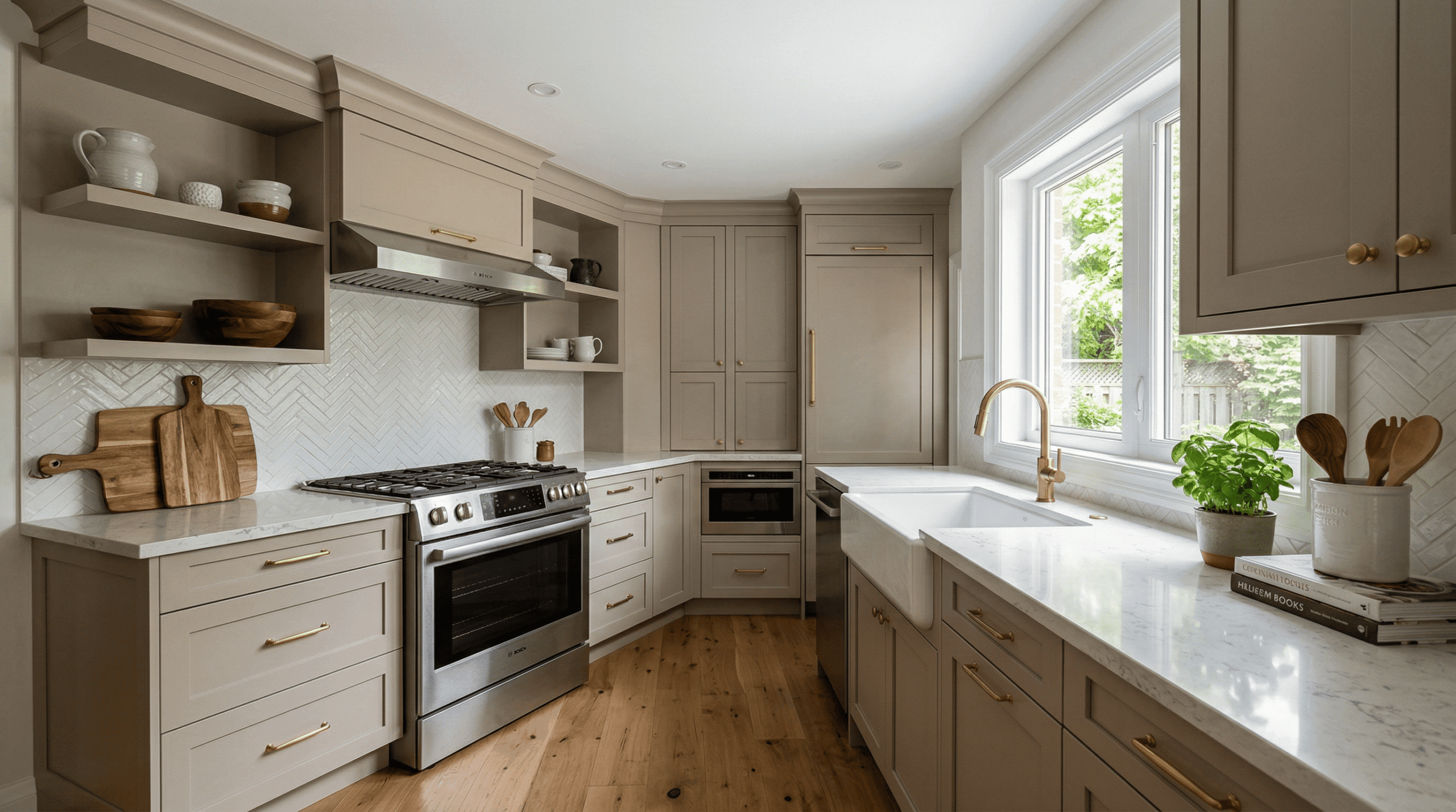 Can’t decide between sleek modern and cozy traditional? You don’t have to! A transitional kitchen in North York blends the best elements of both worlds. This style is incredibly popular right now because it offers unparalleled flexibility. A transitional kitchen in North York might feature the clean, shaker-style cabinets of a modern design paired with the warm, natural stone counters of a classic layout.